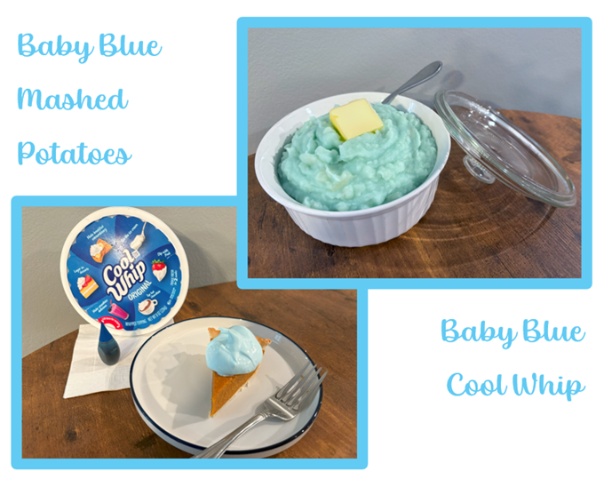 Picture this... Family's serving Baby Blue mashed potatoes for Thanksgiving dinner. A fun and amusing way to create awareness of this movement. Churches across the United States can share this idea with churchgoers during church services leading up to Thanksgiving as a fun way to promote this cause. Mix 5 drops of blue food coloring in 1 cup of milk to dilute per 4 pounds of potatoes, should do the trick! The Baby Blue mashed potatoes will serve as the perfect ice breaker to inform family and friends about this movement and can spark fun conversation about decorating ideas!